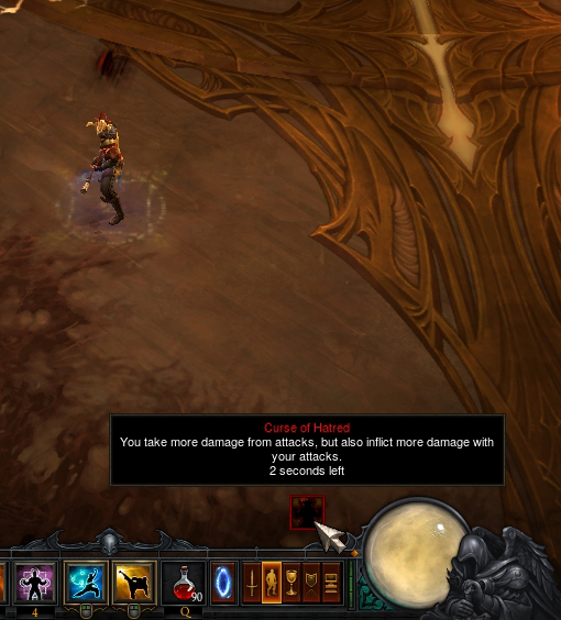 Curse of Hatred is a spell cast by some monsters that increase the damage of their attacks but also yours (v2.05). There are two ways to see if you are affected by this spell. First, there is a little icon above the "Achievements" icon in the menu bar that appears. Hovering over this icon tells you how many seconds are left before the spell terminates. Second, when you are under this spell, there are dark stripes appearing above your head. One of the monsters that uses this spell is Diablo.