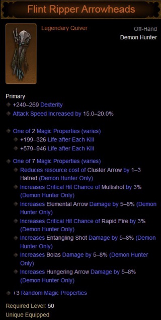 Flint Ripper Arrowheads is a legendary quiver that can be found in Diablo 3 and Reaper of Souls. This item can only be equipped by the Demon Hunter, and will very seldom drop for any other class.