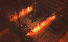 Demon Hunter in the Halls of Agony. Jets of flame emerge from grates in the dungeon floor.