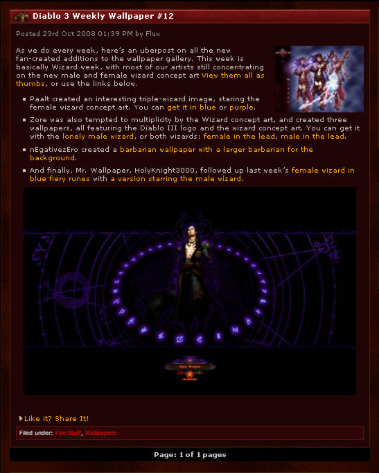 The Diablo III Weekly Wallpaper was a weekly news post that recorded what new artwork people in the fan art wallpaper community posted over the week. This was done as a service for the Diablo community.
