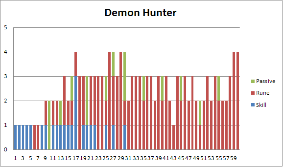 [[File:Char-prog-dh.png|center|frame|Demon Hunter skill progression. Stats as of May 5, 2012.]]