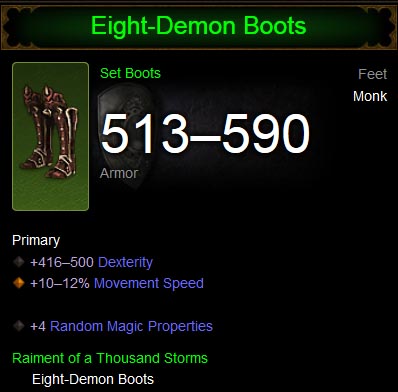 03:15, 21 June 2014 Eight-demon-boots-icon.jpg (file) 15 KB Flux Eight Demon Boots, legendary boots from the Raiment of a Thousand Storms item set. Monk only. category:legendary category:Item Sets category:Legendary Boots 1