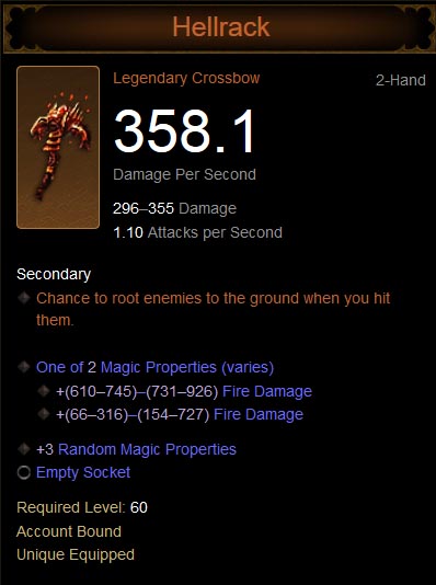 09:23, 2 September 2014 Hellrack-nut1.jpg (file) 115 KB Flux Hellrack, a legendary crossbow. category: Weapons category: Legendary Crossbows category: Crossbows category: Demon Hunter 1