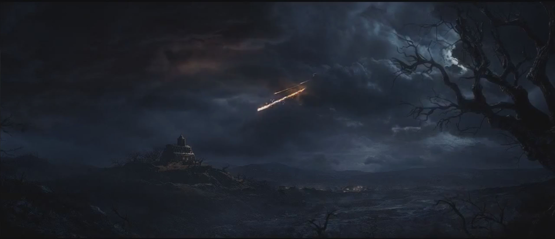Scene from the Diablo III Introduction cinematic, as the falling star streaks down towards the Tristram Cathedral.