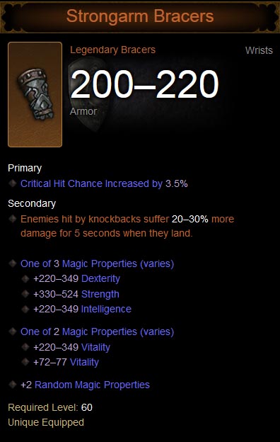 Revision as of 00:16, 13 June 2014 by Flux (talk | contribs) (Strongarm Bracers, a legendary bracer. category:legendary category:bracers category:legendary Bracers)