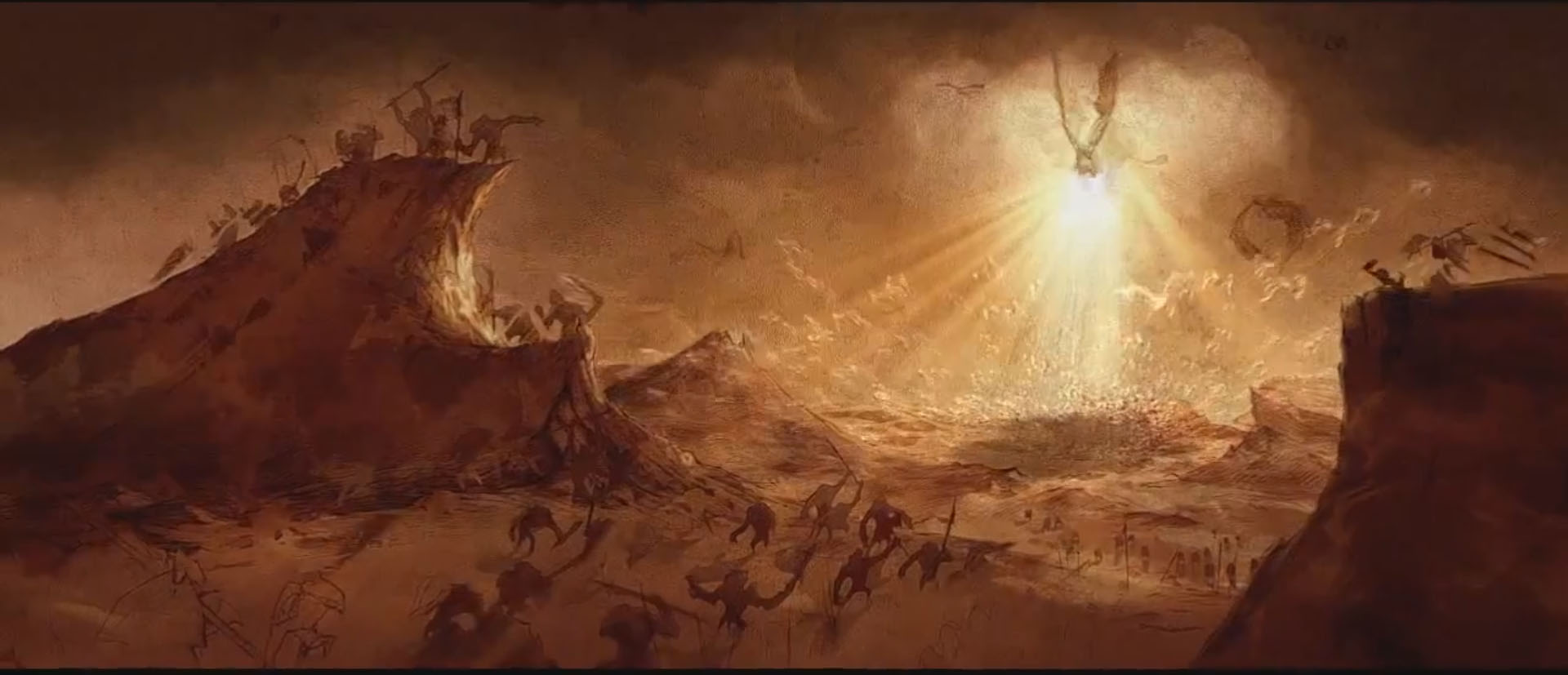 Scene from the Diablo III Introduction cinematic, as the winged army of Angels descends towards the awaiting Demonic legions.