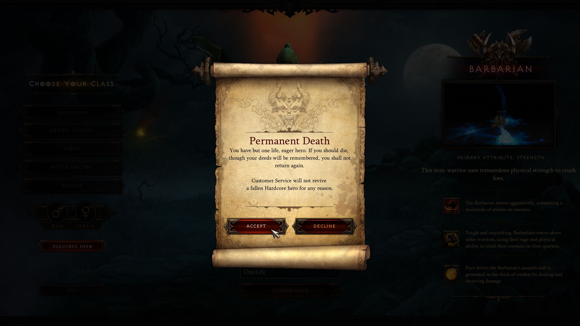 Hardcore character creation warning, as seen in the Beta Patch 14.