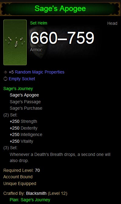 Sage's Apogee, a crafted legendary helm set item.